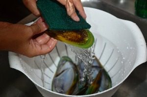 - Školjke školjke temeljito očistite s čopičem in odstranite ostanke morske alge.