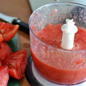 Paradižnik olupite, olupite in sesekljajte z mešalnikom.