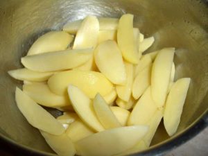 Krompir vlijemo v skledo in zmešamo s papriko, soljo in poper.