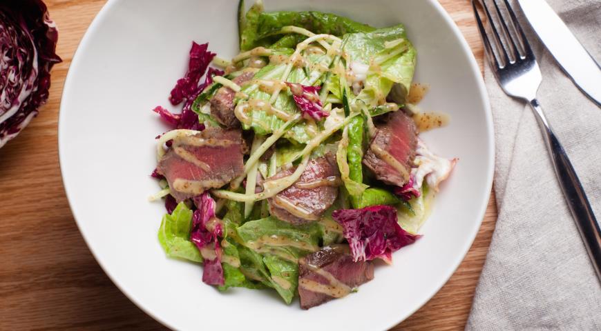 - Na krožnik pristavite mešanico solate, začinite s tartufom in olivno olje, sol in poper. Na vrhu okrasimo s slamicami kumare in blitva. Namastite goveje rezine in začinite nastali preliv.