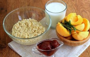 - Ovsene kosmiče pet minut prelijte z vrelo vodo. Marelice razstavite na rezine. Liste pehtrana odstranimo z vej, sesekljamo.