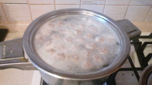 - Na ogenj postavimo lonec vode, z mokrimi rokami bomo oblikovali mesne kroglice in dodamo vreli vodi, odstranimo peno, zmanjšamo vročino oz. sol, poper, dodamo lovorjev list. Kuhajte 30 minut.