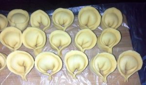 - Na krožnik razporedite nadev, robove zapičite. Konča potegnite v obliki ušes.