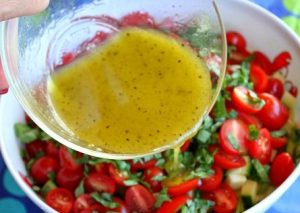 - Združite limonin ali limetin sok, kis, sol, poper, med in olje. Zalijte solato, premešajte.