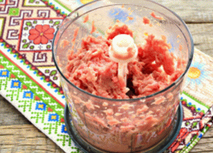 - V mlinčku za meso ali v mešalniku zmeljemo piščančje želodčke skupaj s čebulo. Dvakrat precedite skozi mlinček za meso ali mešalnik.