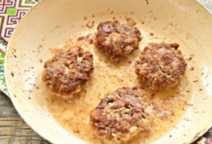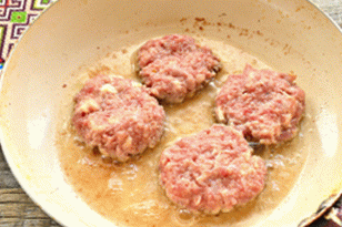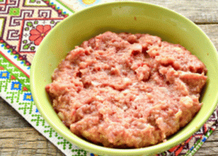 - Rastlinsko olje, predhodno segreto v ponvi širite mleto meso, iz njega modno narežite kotlete. Od nadeva ohlapno, nato pa jo bolje razmažite z žlico.