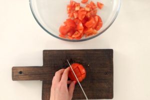 - Zelenjavo grobo nasekljamo, solato z rokami raztrgamo.