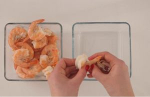 - V skledi zmešamo nasekljano zelenjavo in kuhane kozice.