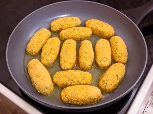- V ponvi segrejte rastlinsko olje, dajte pripravljene palčke in pražimo do zlato rjave barve na obeh straneh.