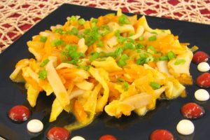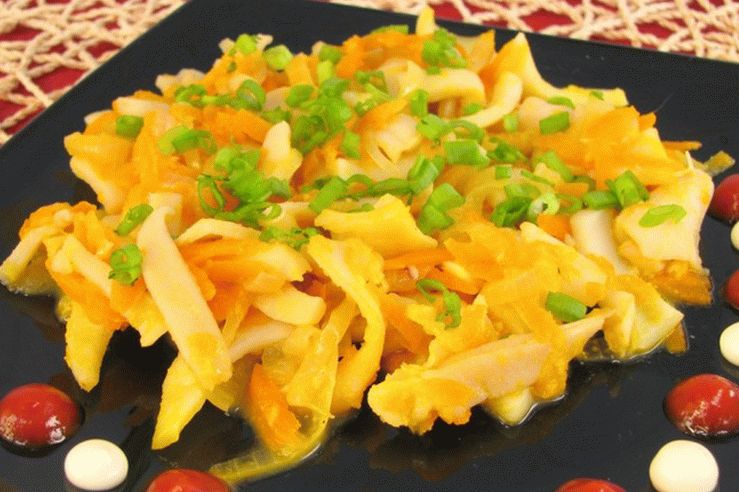 - Lignje, nekoliko odmrznemo, olupimo, operemo, narežemo slamice.