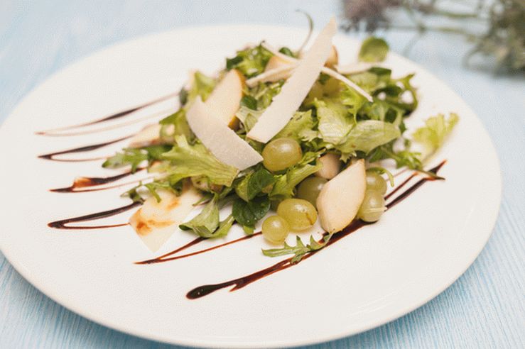 - V ločeni skledi zmešamo hruško, grozdje in liste. solata.