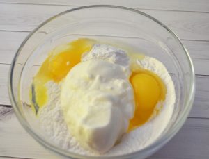 - Združite pecilni prašek, moko, jajca, jogurt (200 g), vanilin.
