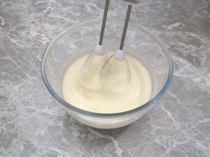 - Za smetano v skledi stepemo smetano s sladkorjem, pomešamo s kremni sir.
