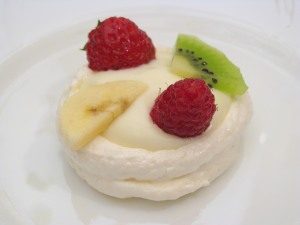 - Pred serviranjem ohlajene meringue napolnite s smetano, okrasite s sadnimi rezinami.