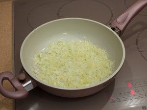 - Za omako v rastlinskem olju v ogreti ponvi prepražimo sesekljano čebulo in česen.