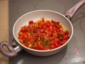 - Dodamo olupljen in drobno sesekljan paradižnik, dušimo za tri minute.