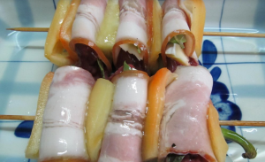 - Slanino zavijte v zvitke. Postavite zvitke na nabodalo zaporedoma jih ločite s trakovi beli poper.