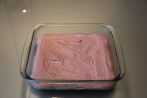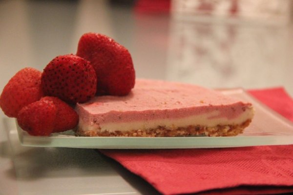 - Preostali masi dodamo jagode, premešamo v mešalniku in ga dajte v obliko. Poslano v zamrzovalnik 3 ure.