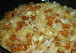 - Sesekljano čebulo v majhnih kockah zatemnite v maščobo, dokler karamelna barva.