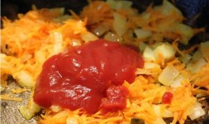 - Na rastlinskem olju narezano čebulo s korenčkom, dodajte jim paradižnikovo pasto in kuhajte 5 minut.