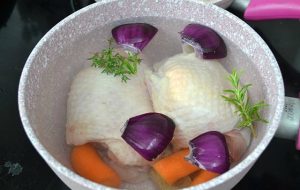 - V majhno ponev položimo piščančje stegno, rožmarin s timijan, narezano čebulo s korenčkom, prelijemo z vodo in kuhamo 20 minut.
