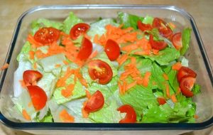 - Solato narežemo in damo v solatno skledo. Daj na vrh nariban korenček in sesekljan paradižnik. Solimo in malo prelijemo olja.
