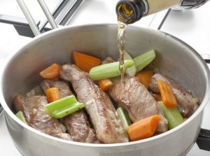 Osupljivo okusna in dišeča svinjska rebra kuhajo doma predhodno ocvrti in dušeni v pivu s čebulo, zelena, korenje in por.