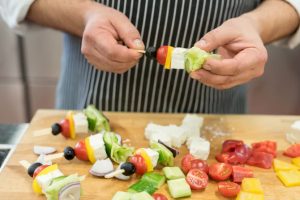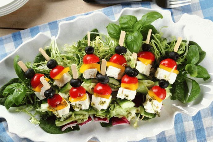 - Ledeno gobo razbijemo na majhne koščke in damo na dno plošče. Preliv prelijte obilno. Na nabodala dajte vse sestavine naključno in jih nežno položite na liste solate, prelijemo preostanek preliva in jed lahko postrežemo za praznično k mizi.