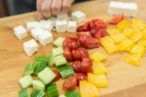 - Narezan sir, kumare, poper in čebulo na kocke debeline 1,5 cm. Paradižnik prerežite na pol.