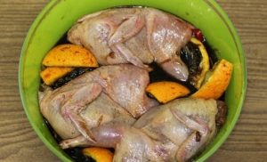 - Prepelice dajo v marinado za eno uro, lahko tudi za aromo dodajte pomarančne lupine.