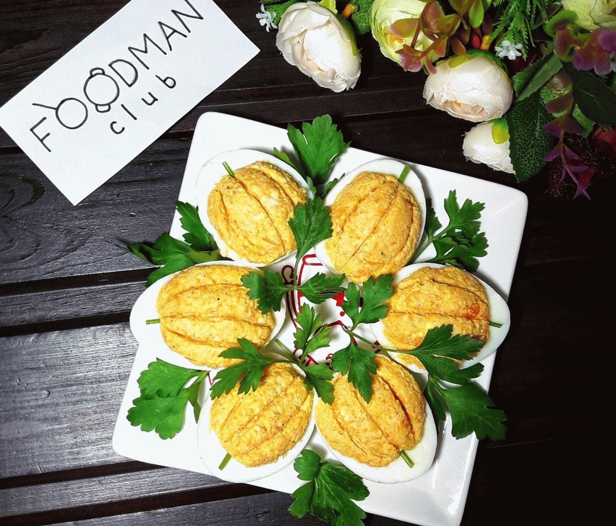 - Jajčne beljake napolnim z našo korenčkovo maso, izdaš enakomerno zaobljene oblike, s pomočjo rebra iz žlice naredim utore spominja na bučo.