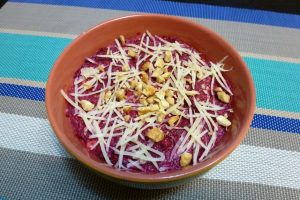 - Sesekljajte oreške, naribajte peso. Zmešajte peso oreščke in začinite z majonezo. Po vrhu sira razporedite sir.