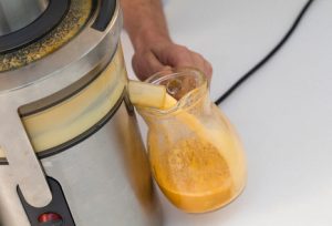 - Sok iztisnemo iz korenja, ingverja, kumare, jabolk in hrušk. Eno odložite četrtino hruške.