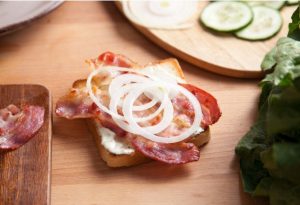 - Slanino damo v prvo plast. Zgoraj – čebula, nato paradižnik in par kumar.