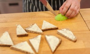 Pravokotne rezine kruha (lahko vzamete ržen ali pšenico) prerežemo na pol na trikotnike in namažemo z oljem. Avokado olupimo in polovico narežemo na tanke dolge koščke.