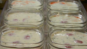 - Na dno skodelic za pripravo jogurta postavite jagode.