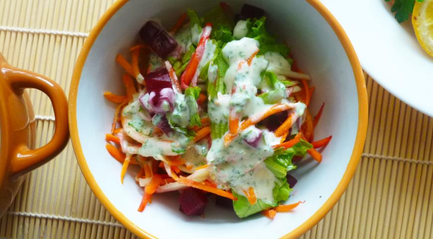 Tako barvita, svetla in kar je najpomembneje, zelo okusna zelenjavna solata od bučk, korenja in pese z začinjenim prelivom je precej preprosto kuhati doma. Svetujem, da si solatni preliv naredite po naravni jogurt.