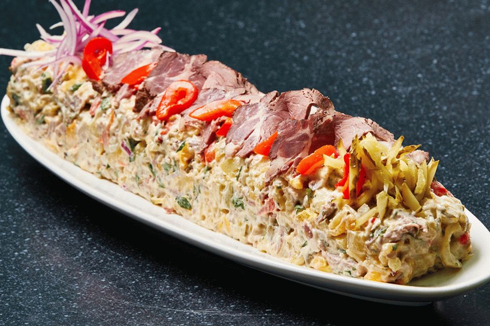 - Preden postrežete, še enkrat zmešajte solato, jo položite lepa jed in okrasite s pečenim poprom, tankimi rezinami goveje in čebulno perje.