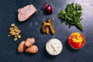 Srčna, okusna solata z govedino in pečenim poprom, ki enostavno kuhati doma – odlična možnost za praznično mizo. Takšno solato lahko naredimo s puranjim filejem.