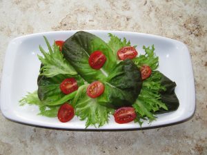 - Moje kumare, narezane na tanke trakove, narezan češnjev paradižnik v polovice.