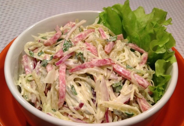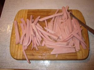 Kuhano klobaso zdrobite na grobo grater ali narežite na trakove, ga dodajte v zelje.