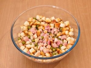 - V veliki skledi združite vse pripravljene sestavine in tudi konzerviran grah (odtočna voda), sesekljan česen, dobro premešamo