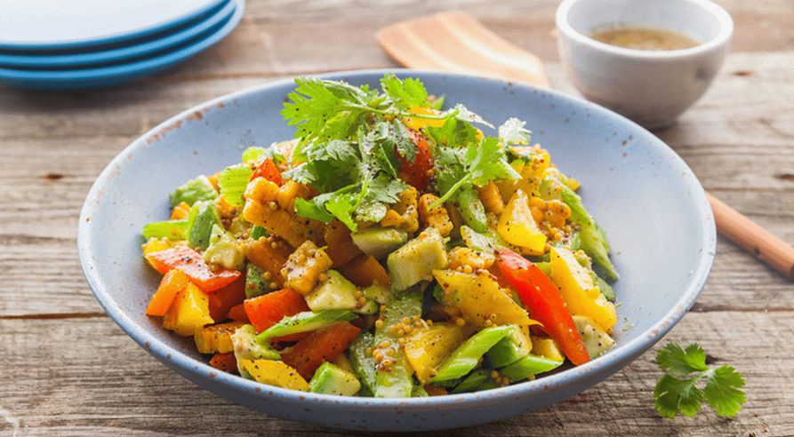 - Iz koruze narežemo zrno, na hitro zmešamo s poprom oz. zelenjava in avokado, prelijemo preliv, sol in poper, potresemo cilantro in postrežemo.