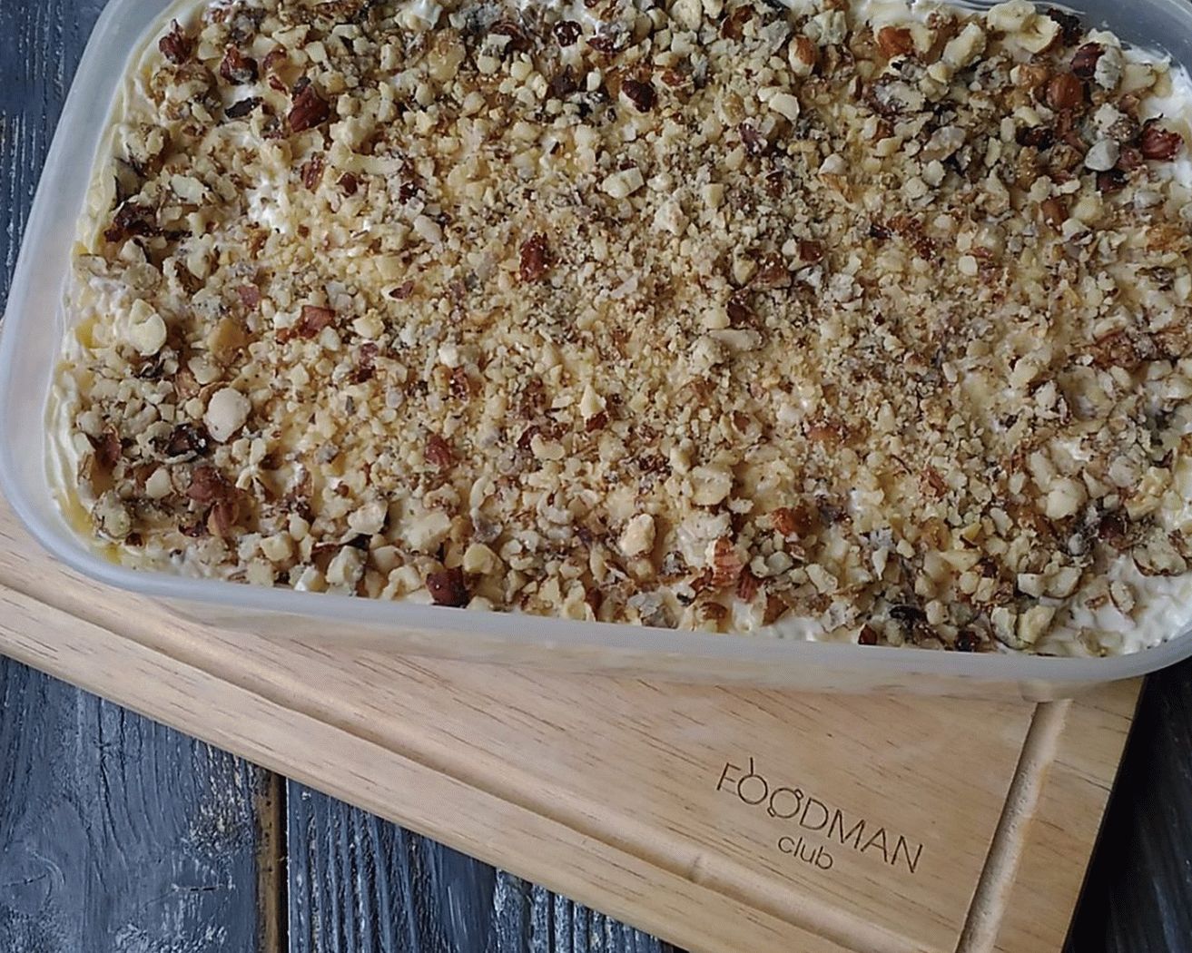 - V plitvi posodi razporedite solato v tankih plasteh: beljakovine – majoneza – piščanec – majoneza – čebula – jabolka – majoneza – rumenjaki – sir – majoneza – oreški